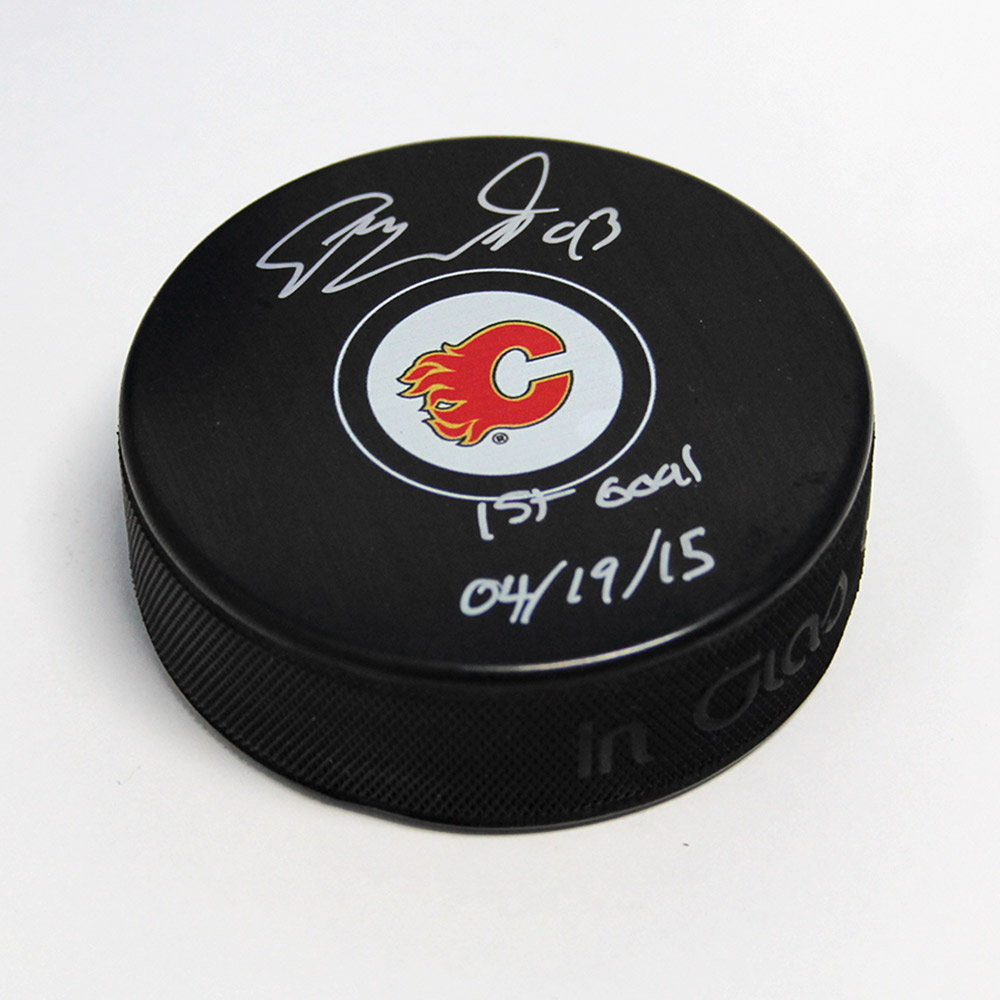 Features- Sam Bennett Calgary Flames Autographed Hockey Puck with 1st Goal Inscription
