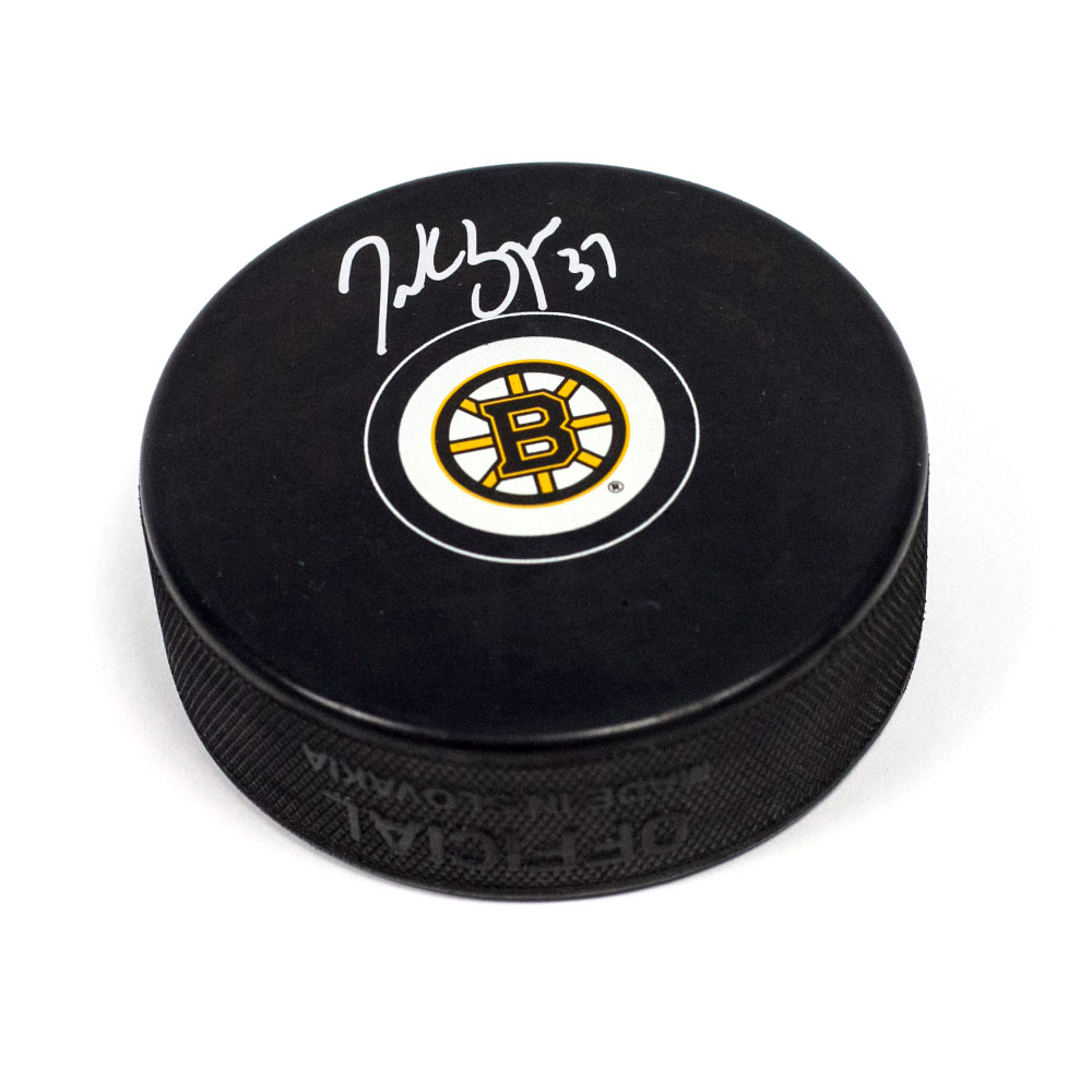 Features- Patrice Bergeron Boston Bruins Signed Autograph Model Hockey Puck