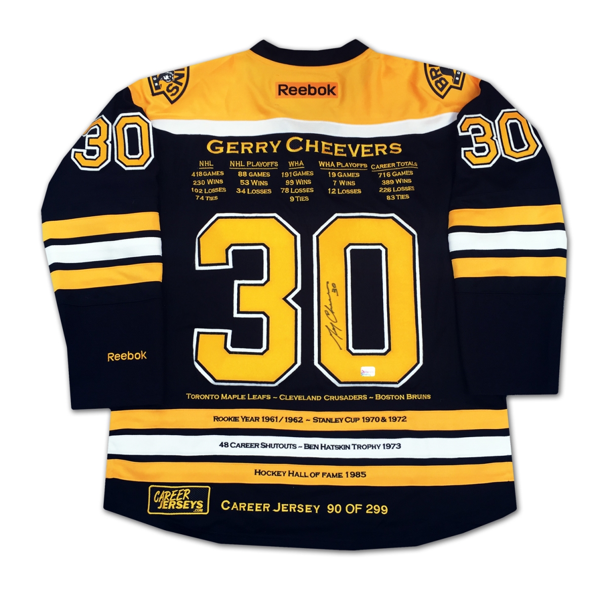Features- Gerry Cheevers Boston Bruins Autographed Career Stats Hockey Jersey No. 299