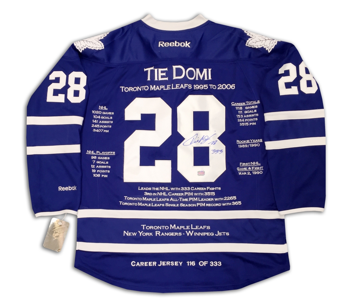 AJ Sports World career-jersey-domi-01 Tie Domi Toronto Maple Leafs Autographed Career Stats Hockey Jersey No. 333