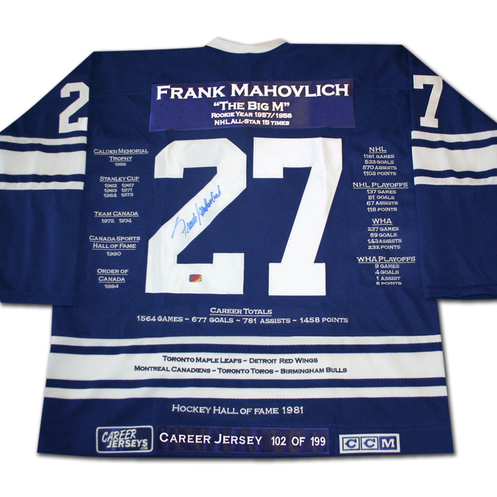 Features- Frank Mahovlich Toronto Maple Leafs Autographed Career Stats Hockey Jersey No. 199