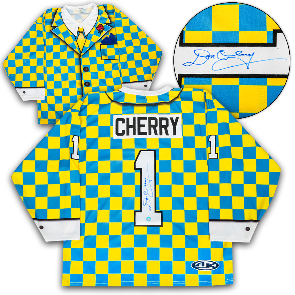 Features- Don Cherry Autographed Yellow Checkered Custom Suit Hockey Jersey