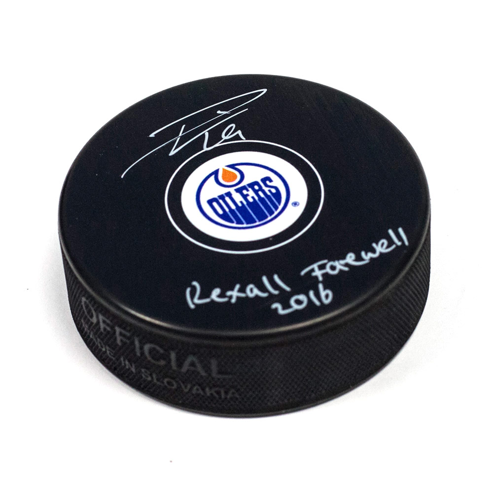Features- Leon Draisaitl Edmonton Oilers Signed Hockey Puck with Farewell Rexall Note