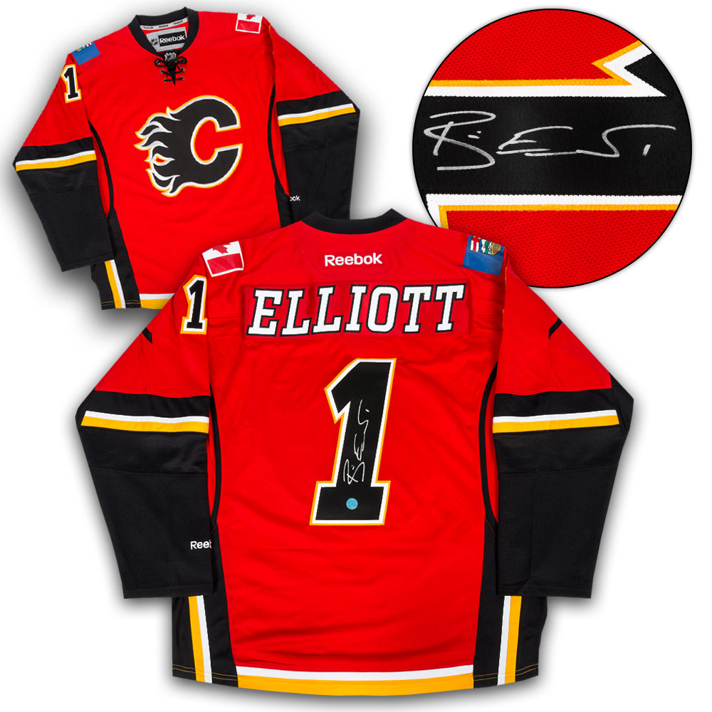 Features- Brian Elliott Calgary Flames Autographed Reebok Premier Hockey Jersey