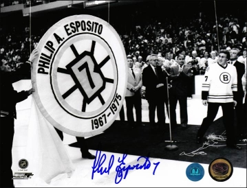To protect your investment, a Certificate Of Authenticity and tamper evident hologram from A.J. Authentic is included with your purchase for an unconditional lifetime guarantee of authenticity. - AJ Sports World ESPP102023 PHIL ESPOSITO Boston Bruins SIGNED Jersey Retirement 8x10 Photo