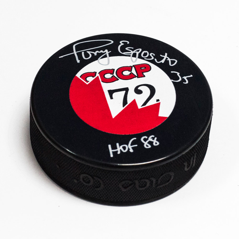 Features- Tony Esposito Team Canada Autographed 1972 Canada & CCCP Hockey Puck
