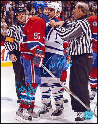 This Hand-Signed Photo has been beautifully and personally autographed by Doug Gilmour & Tie Domi . To protect your investment a Certificate Of Authenticity and tamper evident hologram from A.J. Authentic is included with your purchase for an unconditional lifetime guarantee of authenticity.