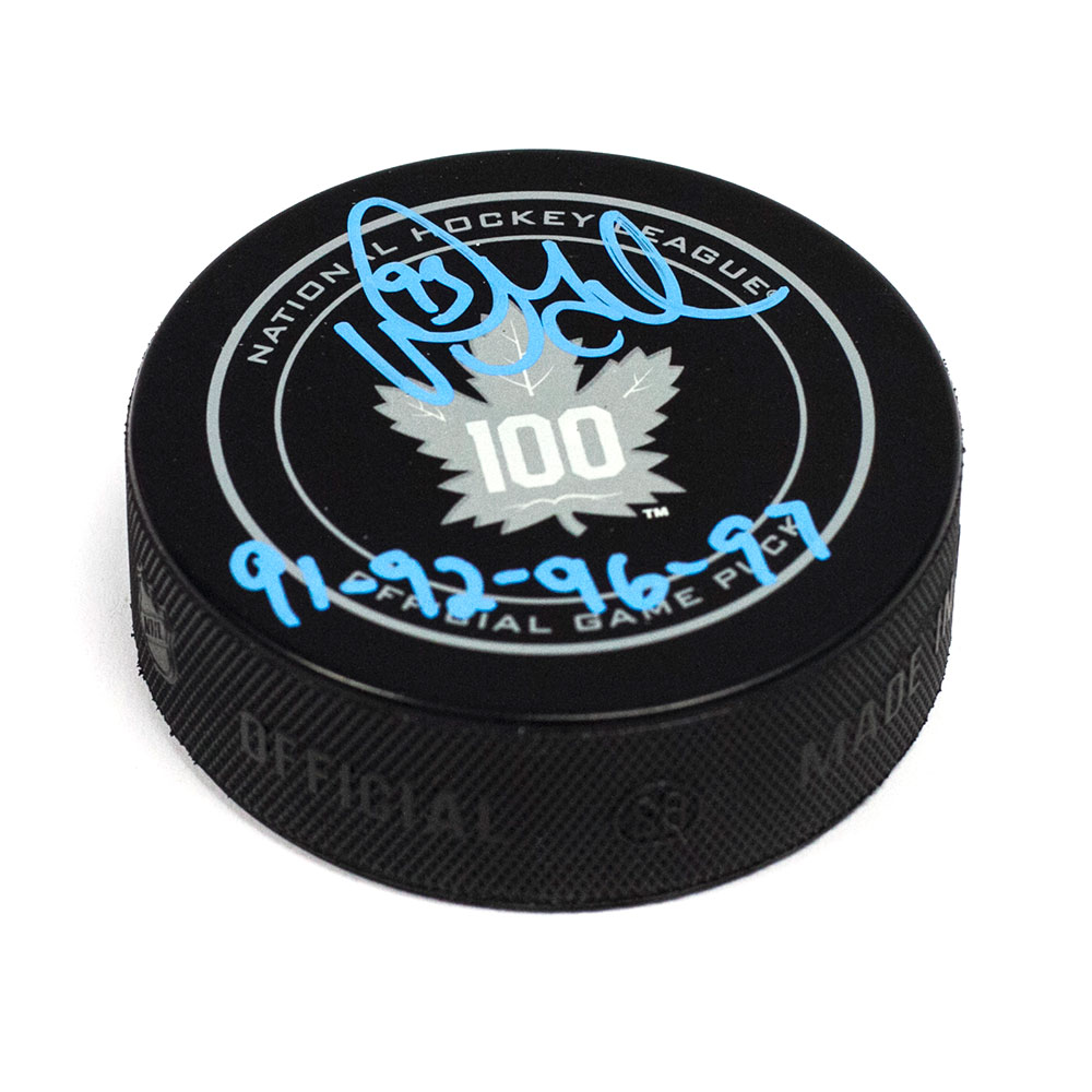 Features- Doug Gilmour Toronto Maple Leafs Signed with Years Played Centennial Hockey Puck