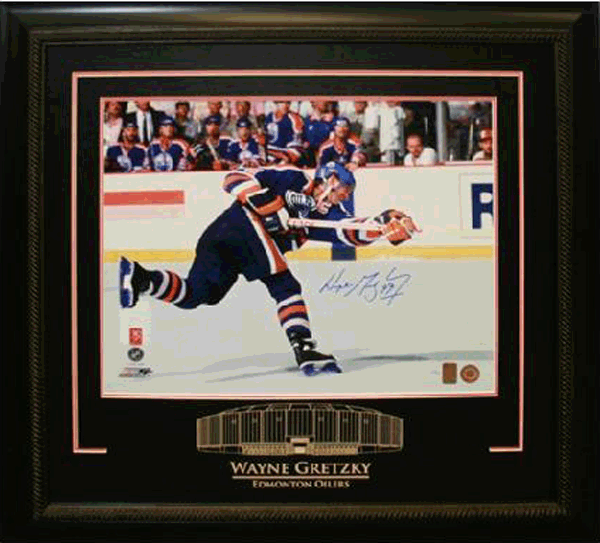 Features- Wayne Gretzky Edmonton Oilers Autographed Hockey Slapshot LE No. 99 Frame