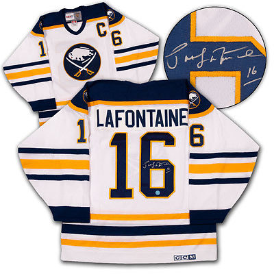 This is an official licensed hand-signed Pat Lafontaine Buffalo Sabres jersey. The jersey is brand new with all of the lettering and numbering professionally sewn on. The player has beautifully and personally autographed the number. To protect your investment a Certificate Of Authenticity and tamper evident hologram from A.J. Authentic is included with your purchase for an unconditional lifetime guarantee of authenticity.