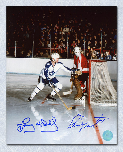 Features- Lanny McDonald & Bernie Parent Dual Signed Maple Leafs vs Flyers Photo