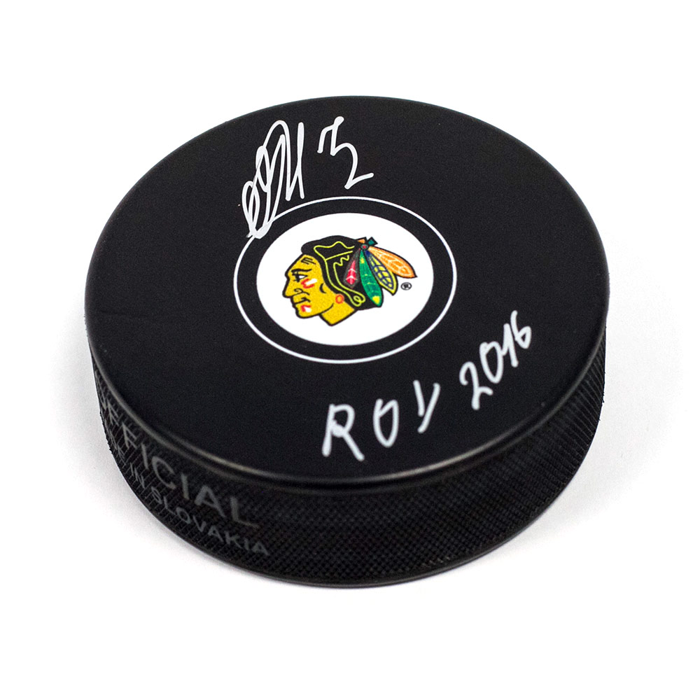 Features- Artemi Panarin Chicago Blackhawks Autographed Hockey Puck with ROY 2016 Note