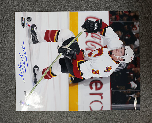 Features- Dion Phaneuf Calgary Flames Autographed White Jersey Action Photo