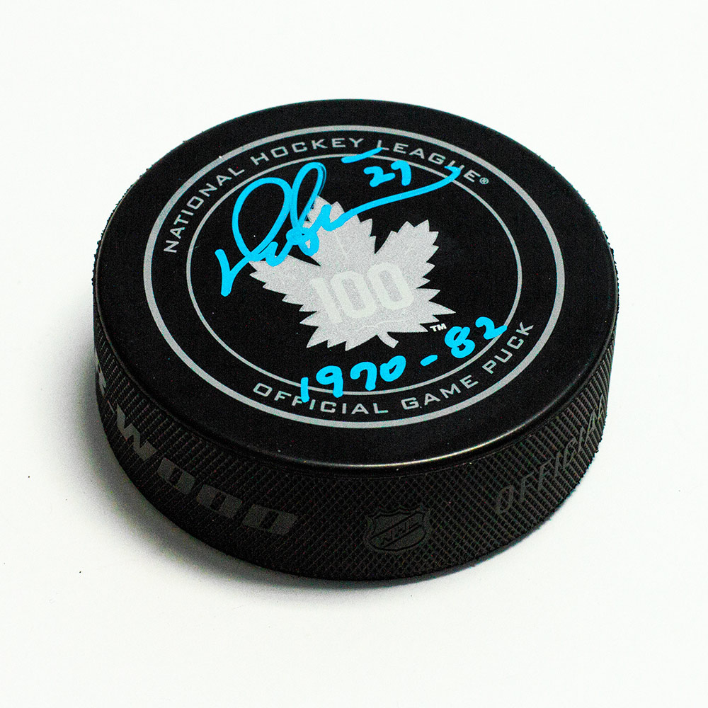 Features- Darryl Sittler Toronto Maple Leafs Signed with Years Played Centennial Hockey Puck