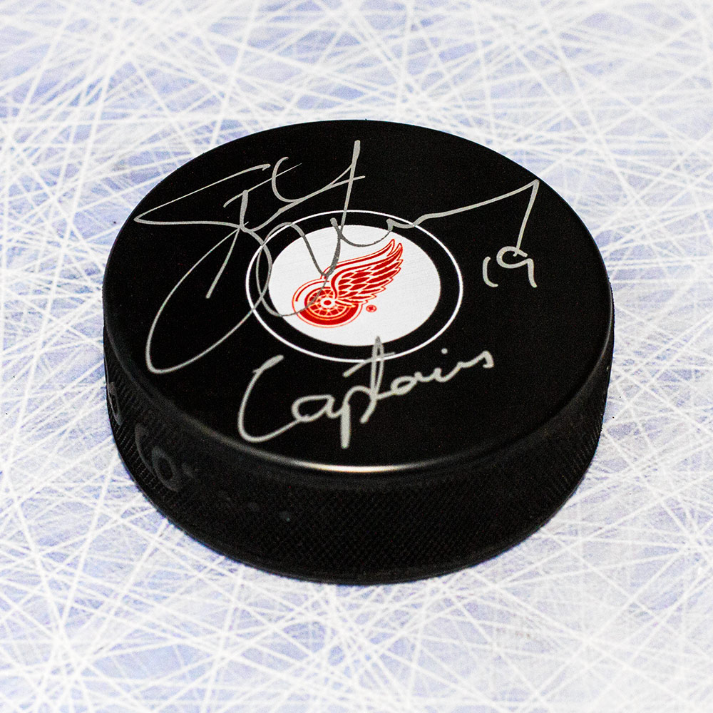 Features- Steve Yzerman Detroit Red Wings Autographed Hockey Puck with Captain Inscription