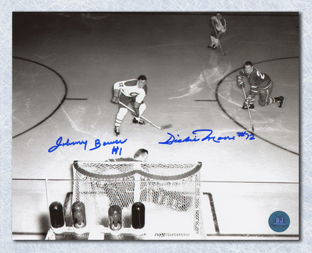 AJ SportsWorld BOWJ10402H Johnny Bower Vs Dickie Moore Dual Signed Legends Showdown Overhead 8 x 10 Photo