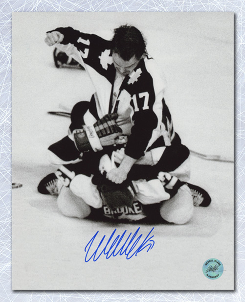 AJ SportsWorld CLAW10403A Wendel Clark Toronto Maple Leafs Autographed Black and White Pounding 16 x 20 Photo